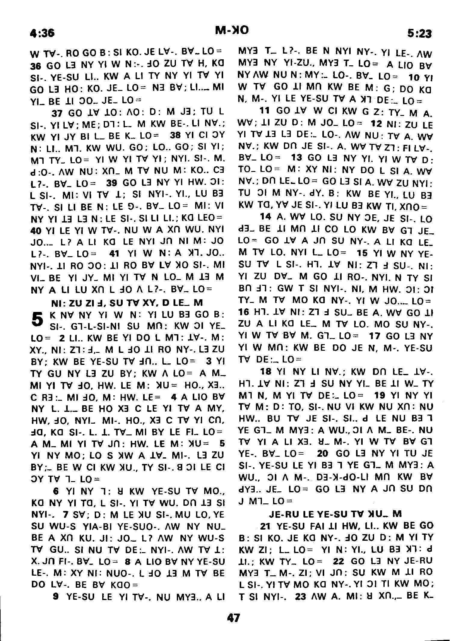 1980年傈僳語聖經全書 馬可福音 4 章 36 節到 5 章 23 節