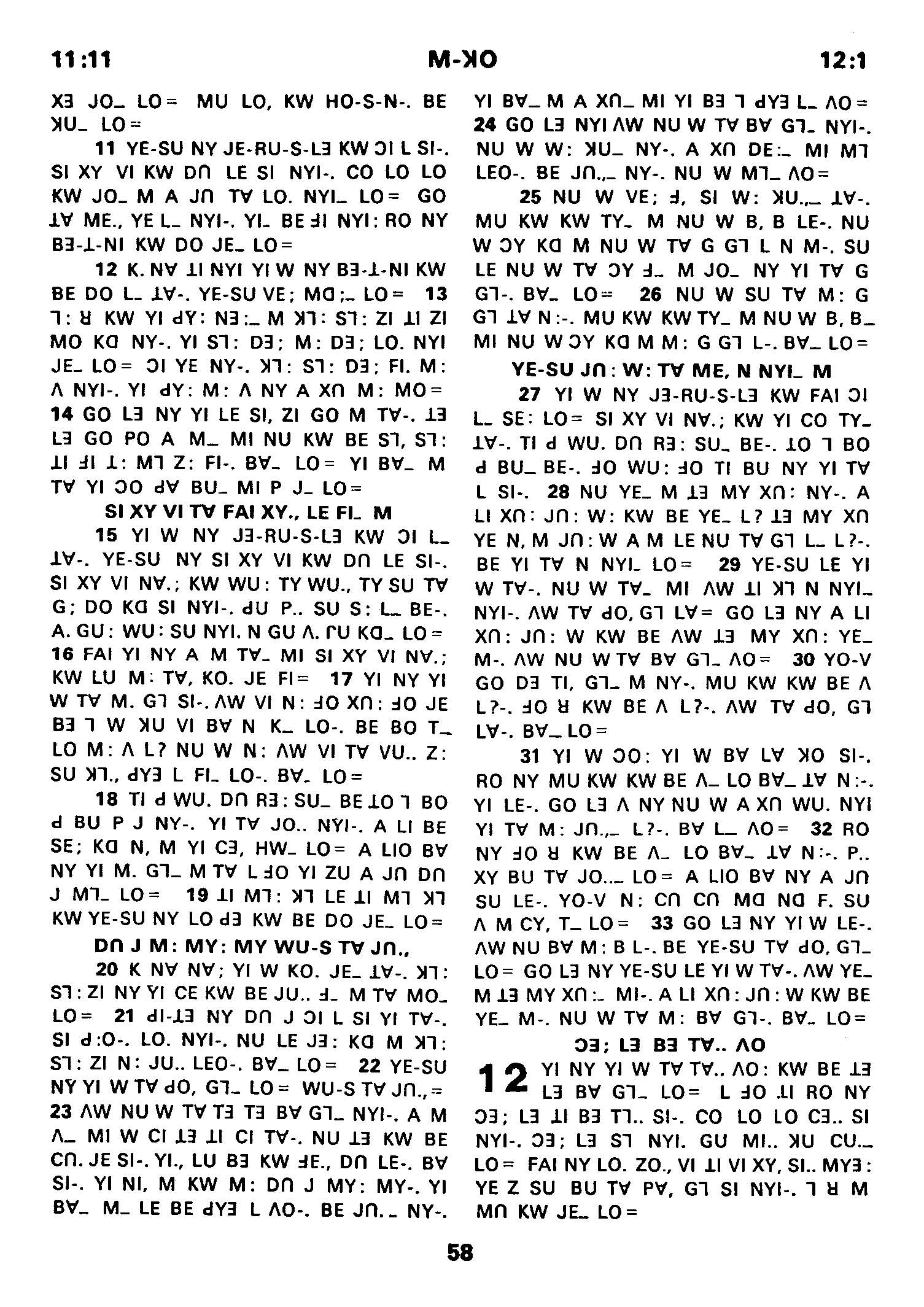 1980年傈僳語聖經全書 馬可福音 11 章 11 節到 12 章 1 節