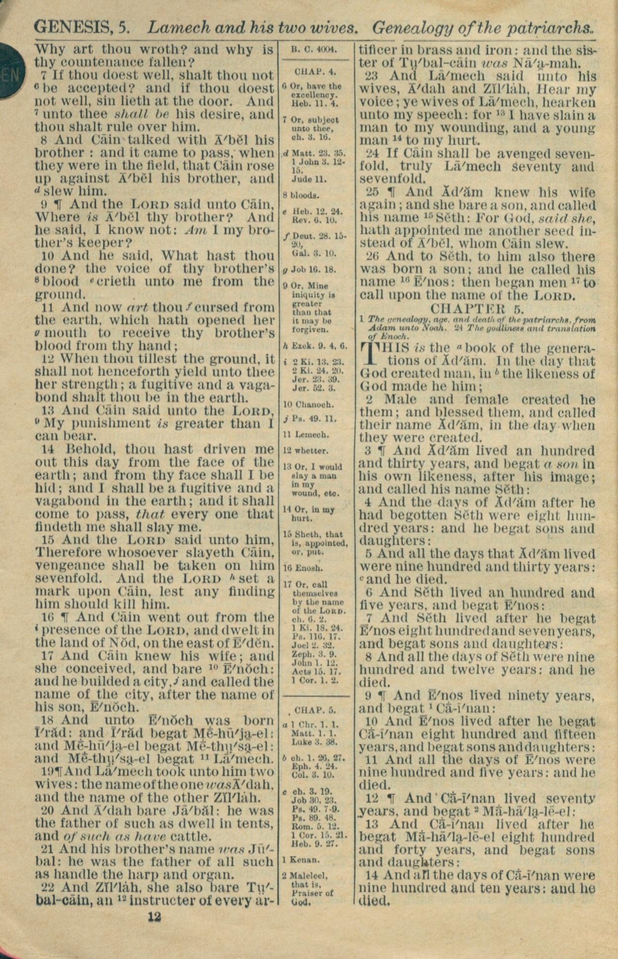 1916年Holy Bible 創世記 4 章 7 節到 5 章 14 節