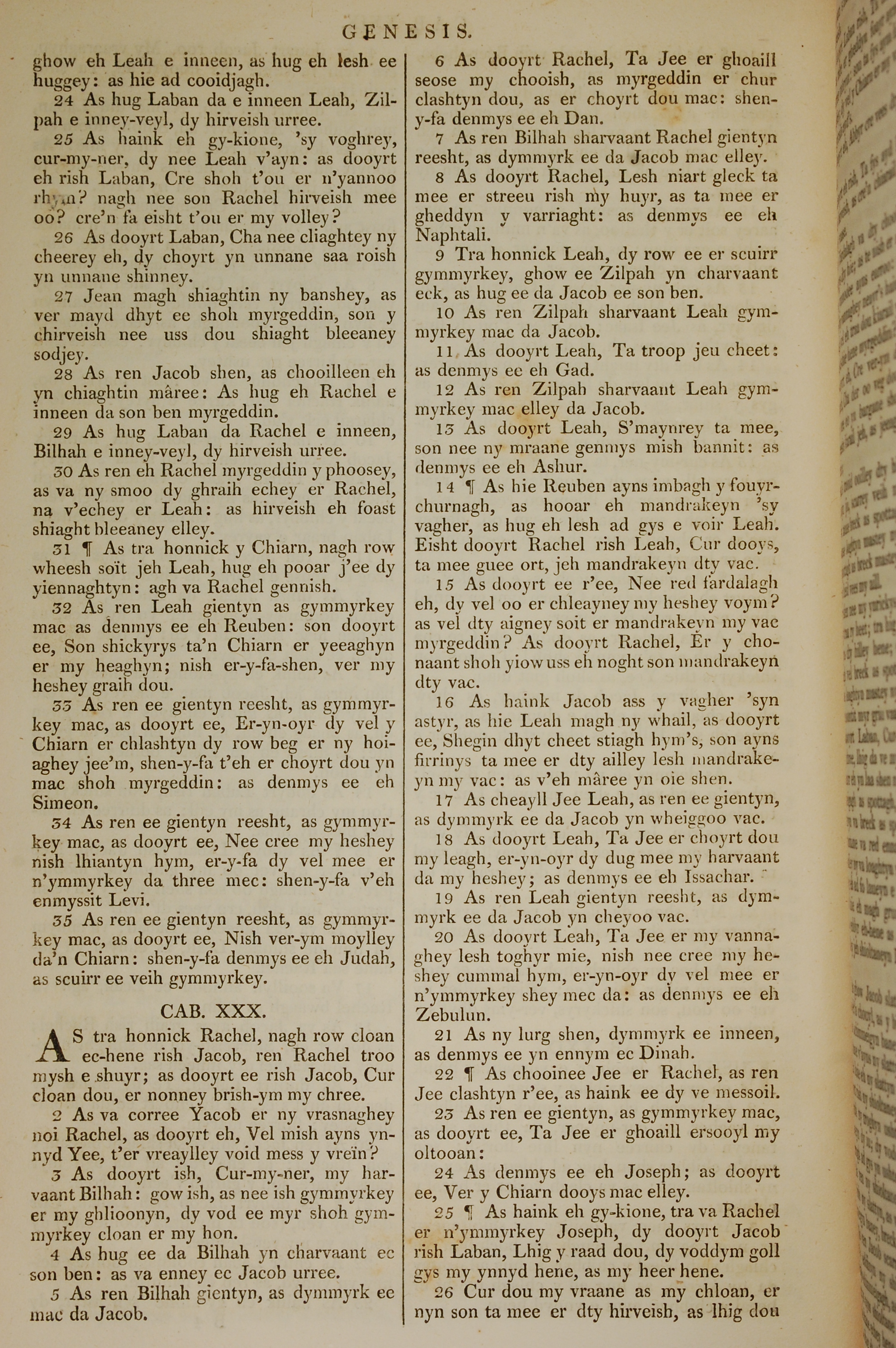 1819年曼島語聖經 創世記 29 章 24 節到 30 章 26 節