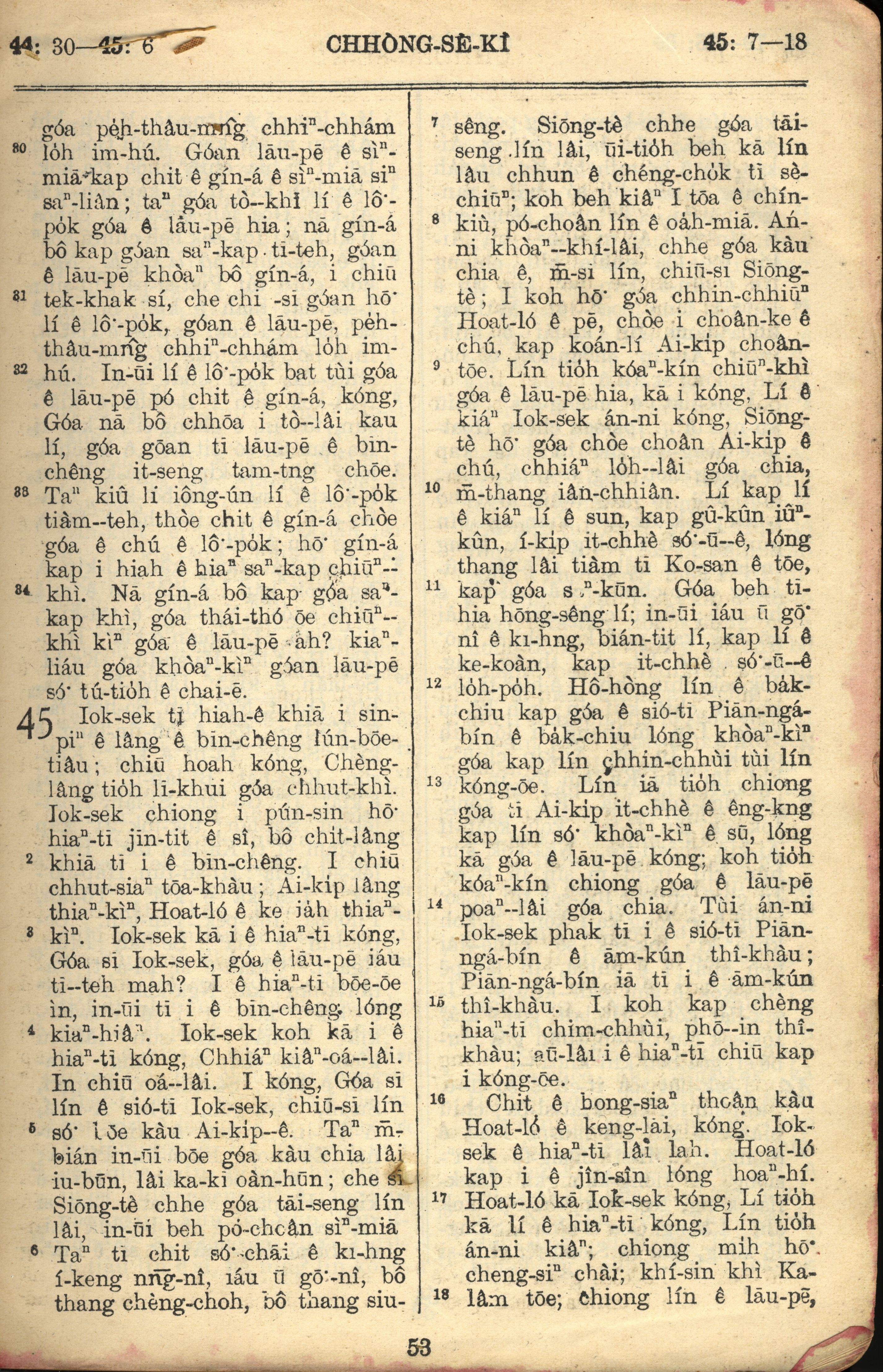 1957年巴克禮全羅台語聖經串珠版 創世記 44 章 30 節到 45 章 18 節